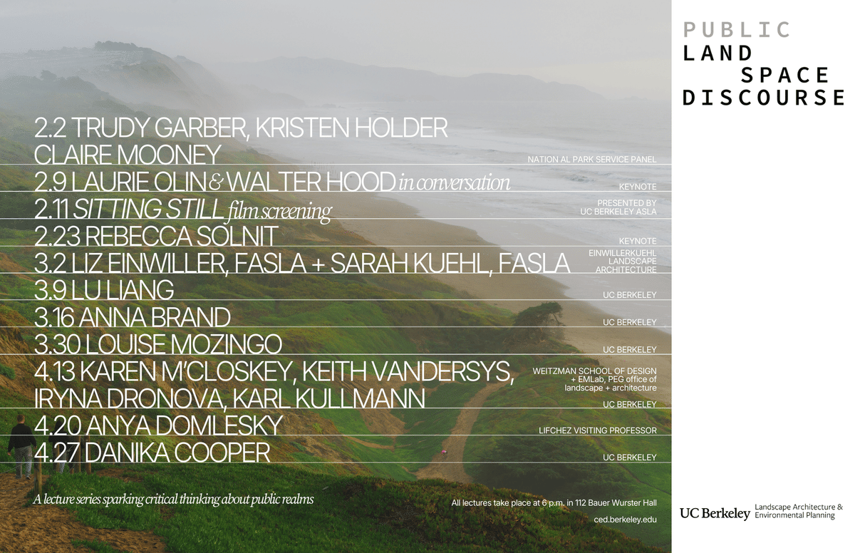 UC Berkeley's Department of Landscape Architecture & Environmental Planning has shared its Spring '26 public event lineup and lecture poster as part of our ongoing Get Lectured series.