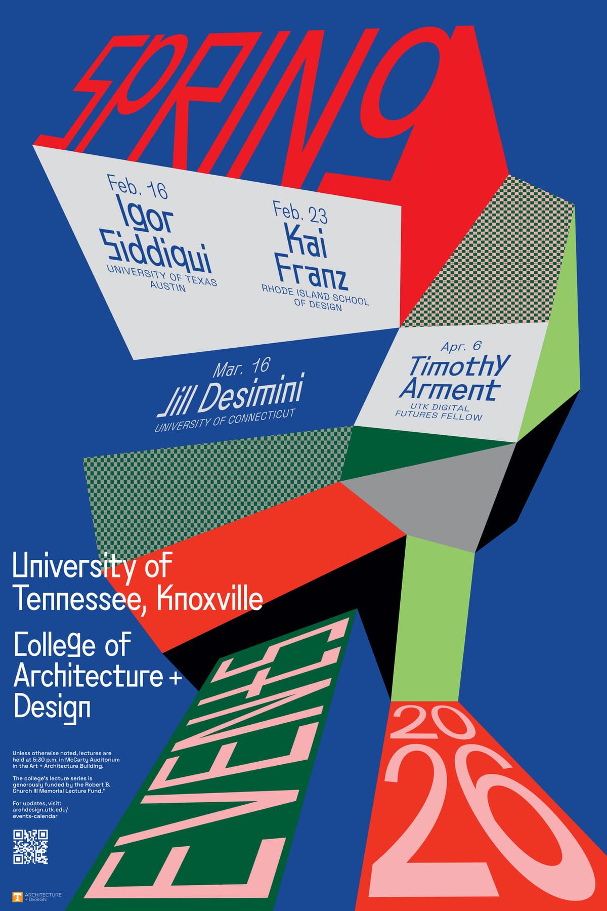 Today's Get Lectured highlights the Spring '26 public events at the University of Tennessee, Knoxville College of Architecture and Design. Becca Lofchie Studio, who also designed their Fall '25 poster, was in charge of the visuals again.